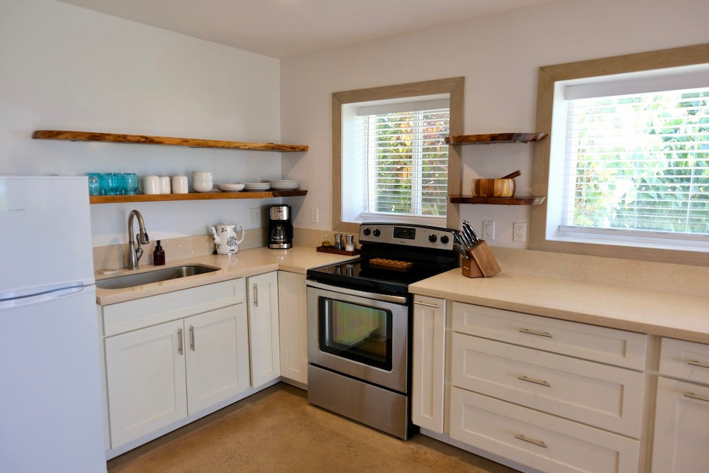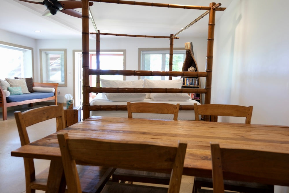 Open floor plan studio located on 2 beautiful acres fronting pristine beach. We offer a Privacy gate entrance for your security, parking on site within the gate.Steps to the sand and ocean. Minimal and beautiful Bali furnishings, full kitchen with all you need to prepare meals, luxurious soaking bathtub and hawaii style outdoor shower. Quiet, beautiful sunsets, stars at night.